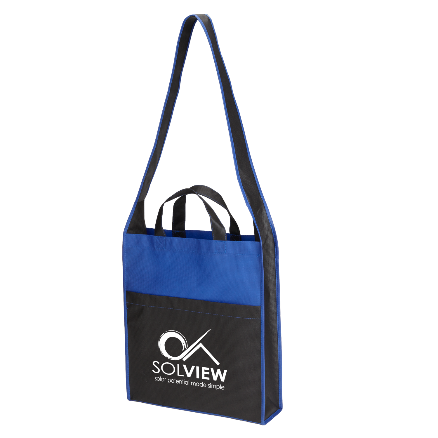 Available in 5 colors including Orange, Lime, Purple, Red, Royal Blue. Key features: Constructed of 80 GSM non-woven polypropylene, Two-tone design with a spacious main compartment and a large front pocket, Features two 7″ carrying handles and a 38″ over-the-shoulder strap. Custom logo imprinting available with multiple decoration methods.